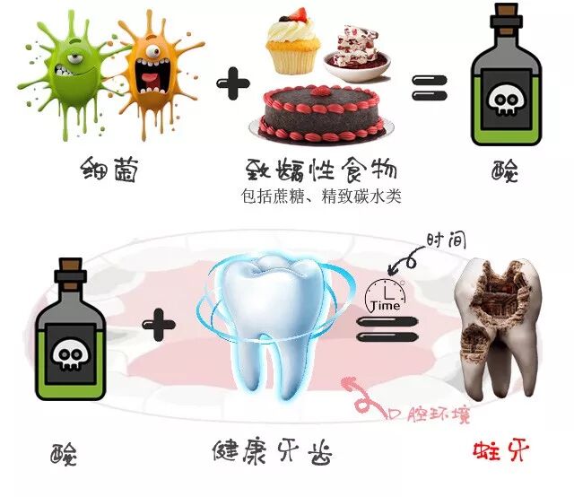 龋齿病因的致病原理:致龋性食物紧紧贴附于牙面,由唾液蛋白形成的获得性膜,得以牢固的附着于牙面,在适宜温度下,有足够的时间在菌斑深层产酸,侵袭牙齿,使之脱矿,并进而破坏有机质,产生龋洞。