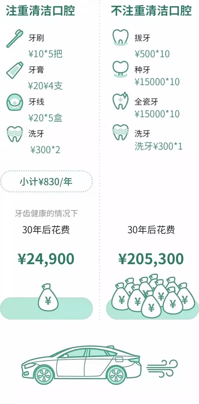 假设你今年20岁,注重与不注重口腔健康,30年后的结果是不一样的,假设注重口腔健康且30年后牙齿健康,不注重清洁口腔10颗牙齿坏掉:
