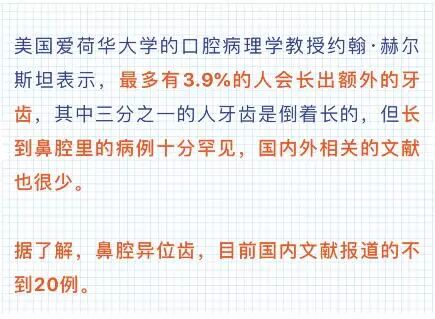 小编也很纳闷,这从来没听过牙齿长在鼻腔里的,更何况齐先生有着一口整齐的好牙。张医生也非常惊讶,她从业18年来,从来没碰到过这种病例。