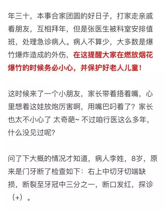 张医生先安抚了下家属情绪,这一家子人陪人太多,情绪激动,大过年的是吧。。根据临床检查,小李娃还算幸运,并没有露髓,拍摄x线片也没有明显根折,在作出相应处理和医嘱后,李家人才算把心放下来。除了小李娃受到惊吓外,全家人还是准备好好的欢度新年,不过这下一个钱饺子可得慢慢咬了。