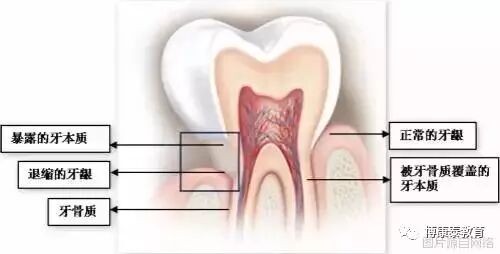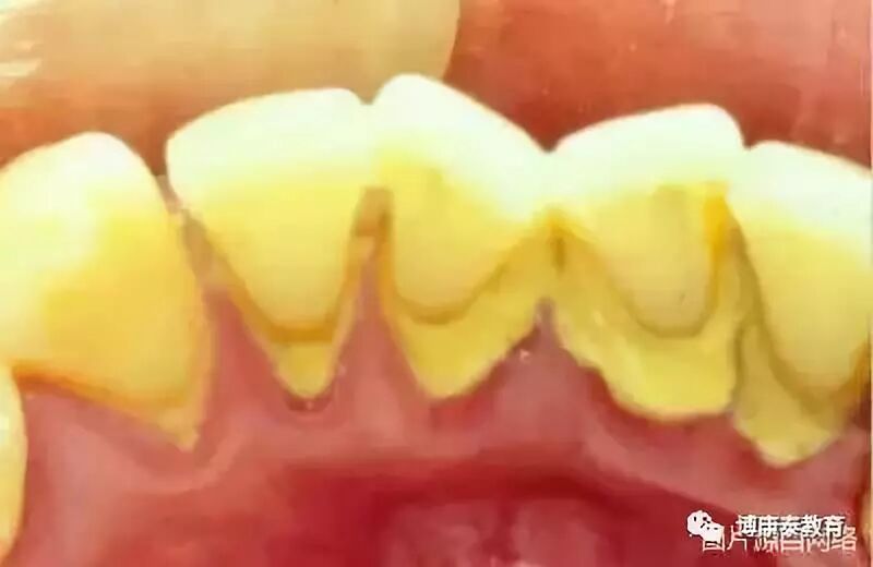 图3 方框内显示牙龈退缩、牙骨质破坏后暴露的牙本质
