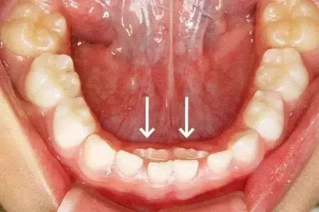 图 继承恒牙已萌出,乳牙未脱落(箭头指示继承恒牙)