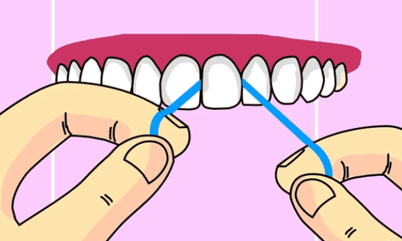 拉紧牙线,沿着牙缝前后左右方向缓和地拉牙线,嵌塞的食物即可随牙线的移动而被带出。